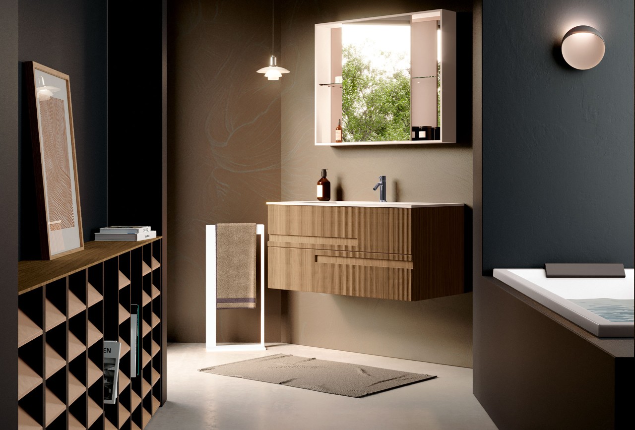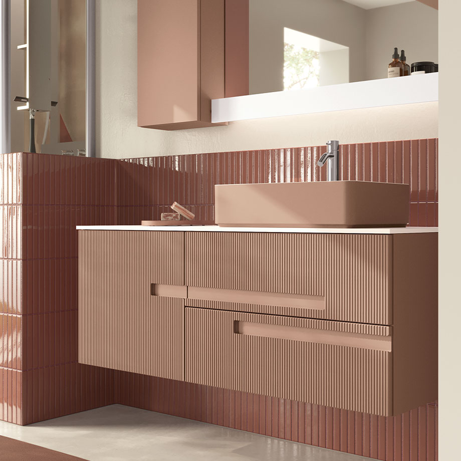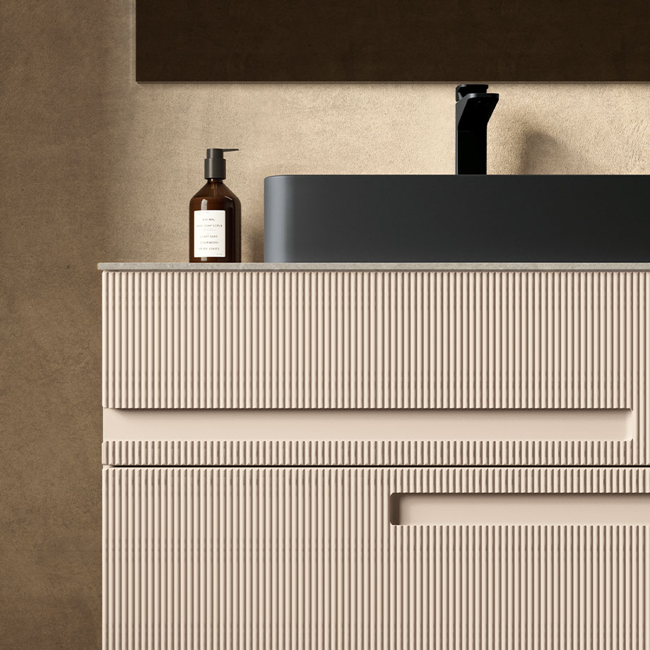 Track series is designed to offer the perfect balance between functionality, aesthetics, and affordability. Its minimalist design is distinguished by the ribbed door with an integrated handle—a detail designed by Marco Pellici that creates visual rhythm and a sophisticated tactile experience, highlighting the purity of the lines and the clean, minimalist form of the entire piece.